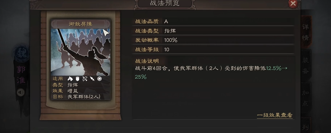 郭淮作为四星武将,后期依然能发挥重要作用。他被称为大魏盾曹操的C位替补,自带御敌屏障战法,十级减伤25%,满红容易,非常好用。满级郭淮的武力是123,智力是143,统率是162,加上满红40点,50级50点,调配上非常方便。他的核心优势在于减伤和辅助能力,适合平民玩家组建高性价比阵容。